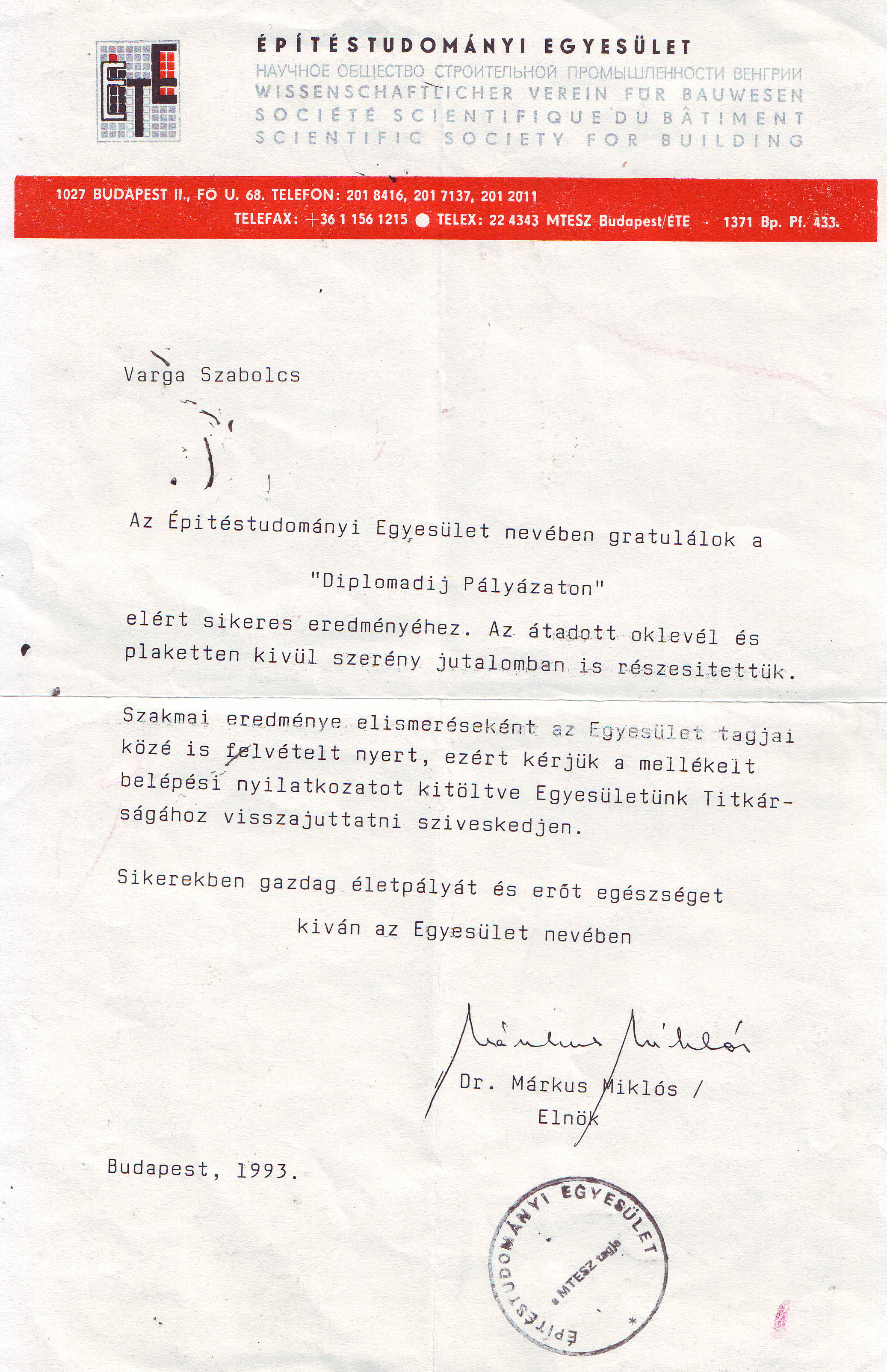 a zaj- és levegőterhelési számítások végzéshez kidolgozott programmal készített diplomamunka (Varga Szabolcs YMÉMF 1993 „Az állami Vizsgáztató Bizottság szakdolgozatát dicséretben részesíti és hasznosítását javasolja”) kapott, melyet az Építéstudományi Egyesület diplomadíj Pályázatán arany éremre méltattak.