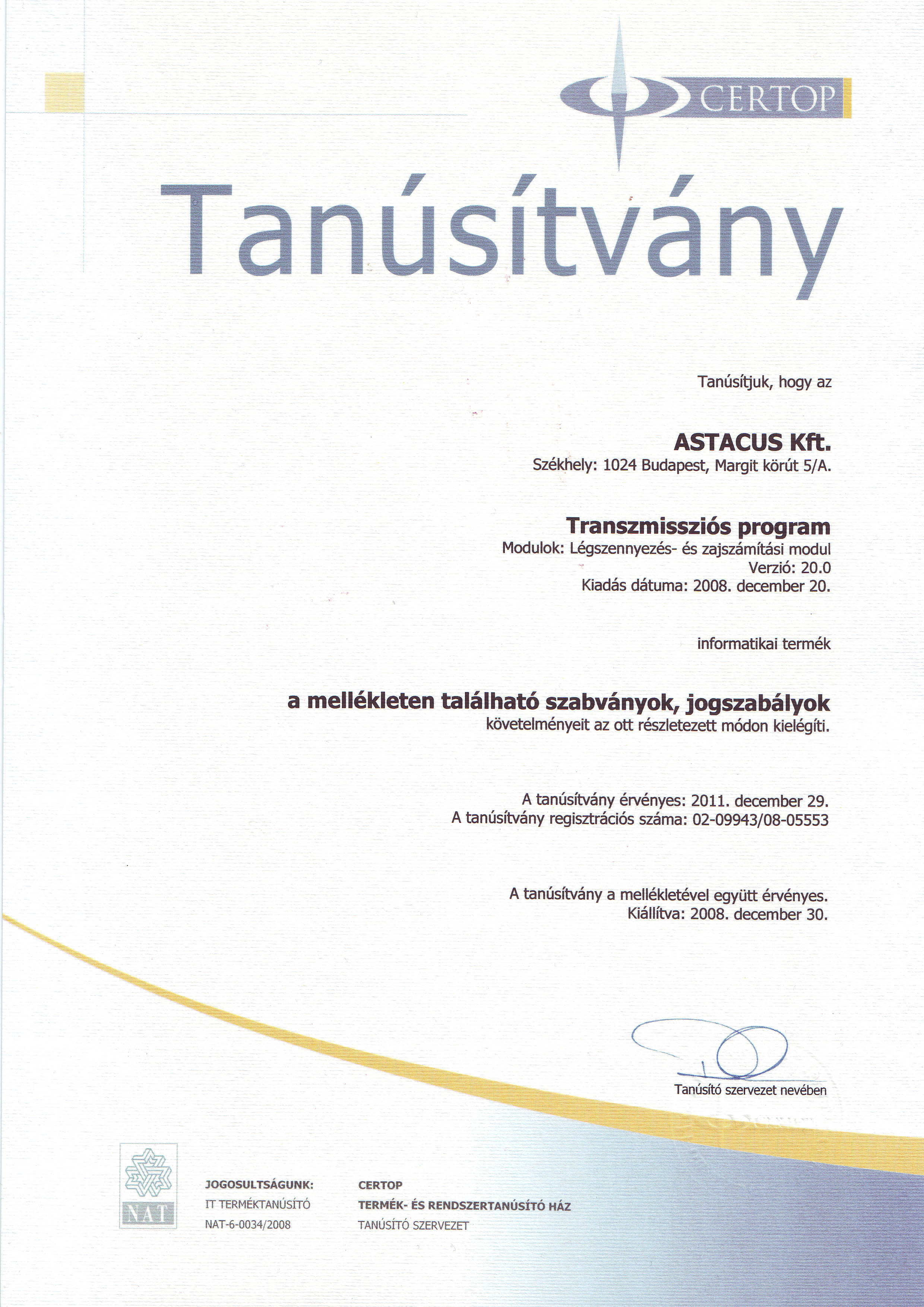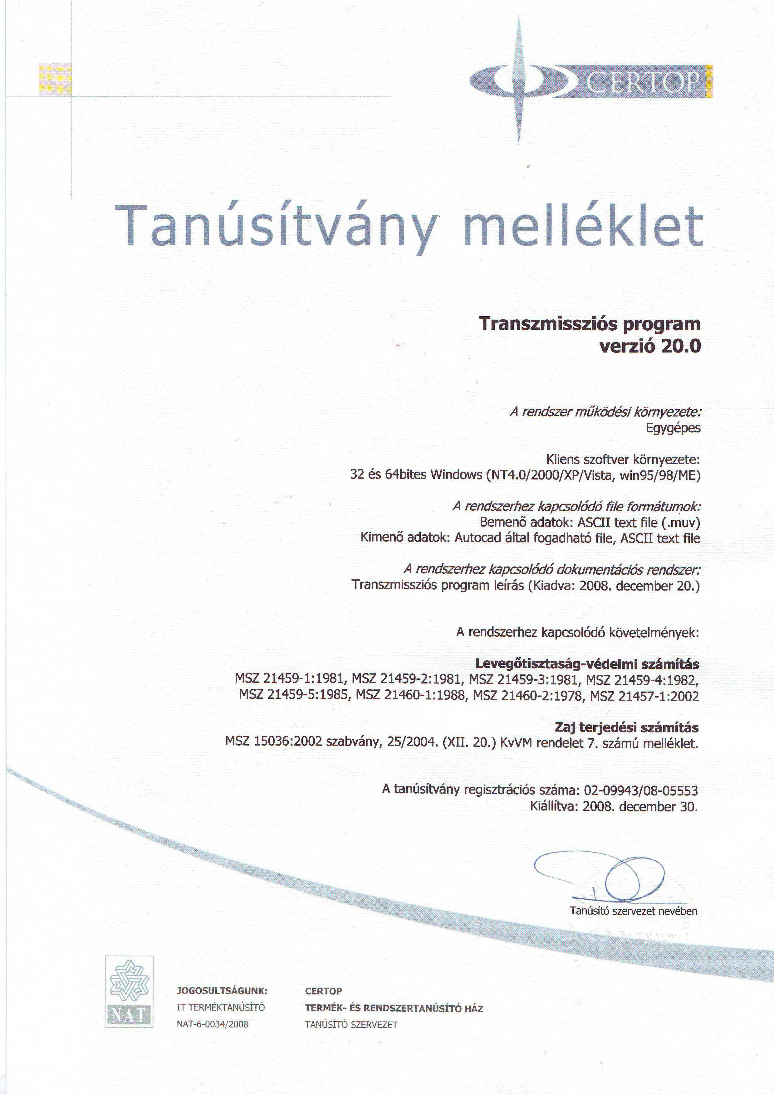 alkalmazott szoftverünk a vonatkozó szabványok és rendeletek alapján a szakértői-, tervezői munka végzéséhez szükséges számítások elvégzésére alkalmasak, (a „Soundplan” és „Lima” programokhoz hasonlóan, viszont ) a „Certop termék- és rendszertanúsító ház” által (02-09943/08-05553 regisztrációs számon) minősítetten.